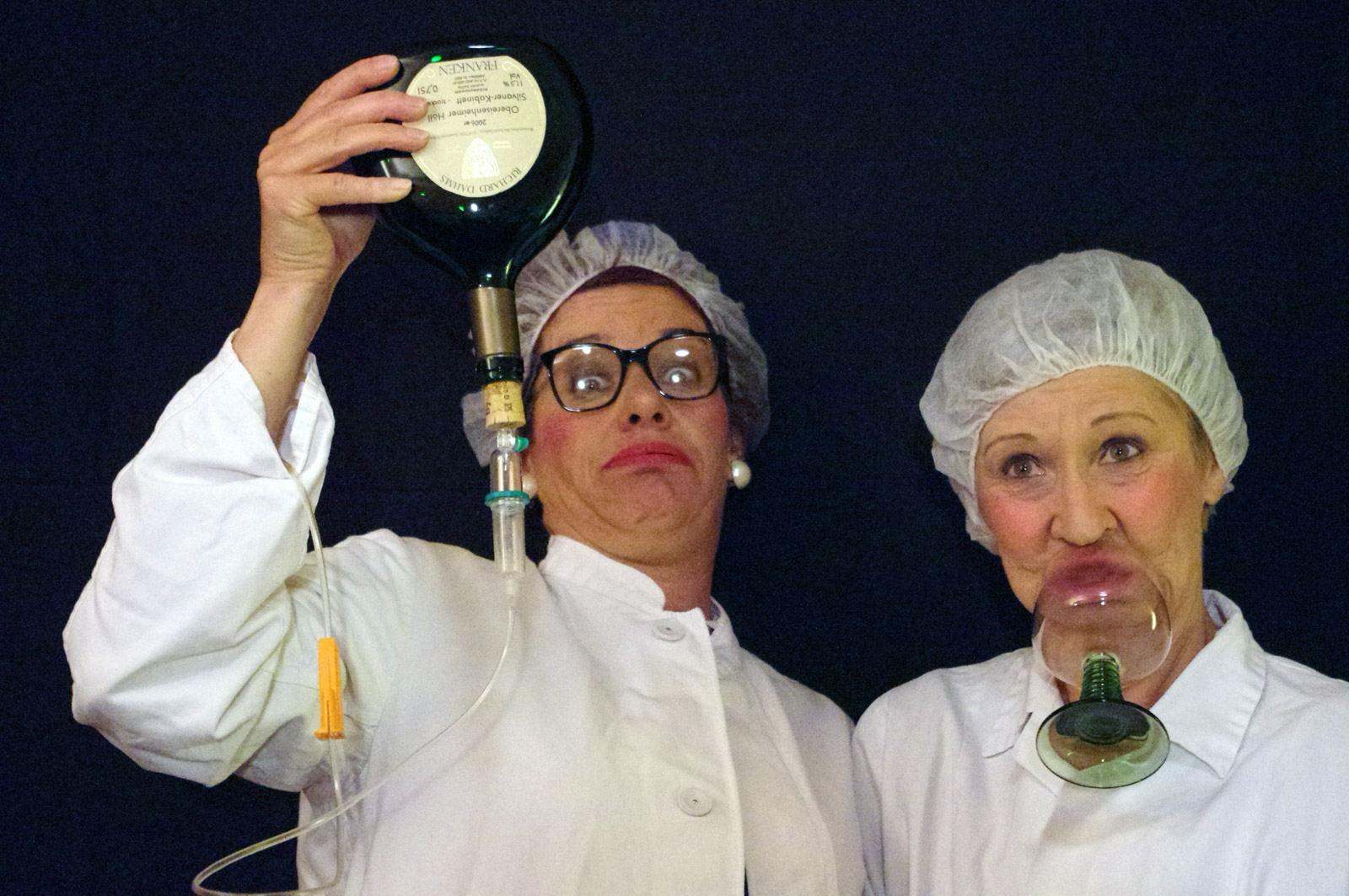 Und die „Altersehrenweinköniginnen“ hatten es in sich, mal als fränkische Weinspieluhr, dann wieder als Labordamen auf intravenöser Weinverkostungstour der anderen Art oder als Wahrer der fränkischen Mundart bliesen sie erfolgreich zur Zwerchfellattacke. Dabei hatten sie zwar weniger Ahnung vom Jahrgang des Weins, als von dem des ledigen Winzers, dafür waren sie Meisterinnen im Weinwitzerzählen und machten dabei auch vor aktuellen Röthleiner Themen nicht halt.